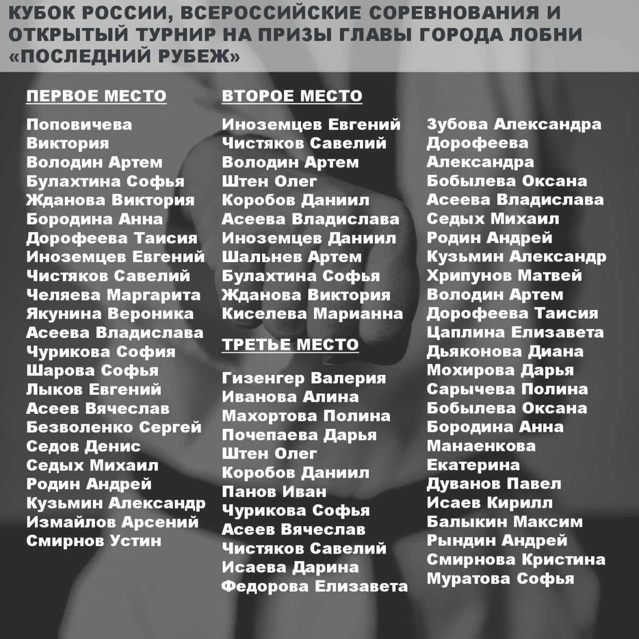 С 5 по 8 декабря в городе Лобня (Московская область) состоялись масштабные соревнования по восточному боевому единоборству — Кубок России, Всероссийские соревнования и открытый турнир на призы главы города «Последний рубеж». В стартах приняли участие 1200 спортсменов из 27 регионов страны.